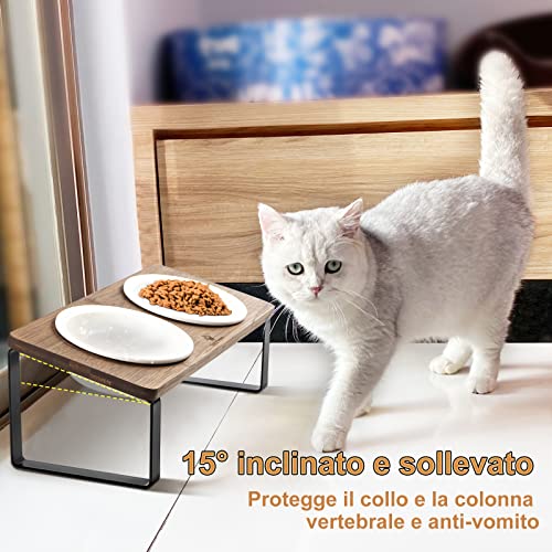 Ciotole per Gatti Rialzate Ciotola Gatto Ceramica Legno 15° Inclinate Gatto Set di Doppio Ciotole per Alimenti Ø14cm con Supporto in Bambù Inclinato Antiribaltamento (Colore Noce)