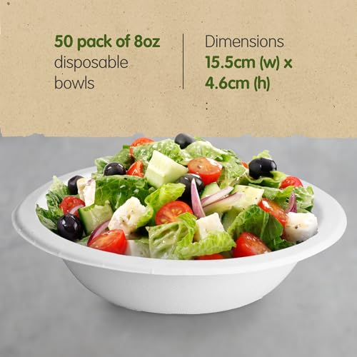 Ciotole Monouso in Bagassa - Piatti Fondi Usa e Getta Riutilizzabili, Rigidi e Resistenti in Polpa di Canna da Zucchero - Stoviglie Bianche Ecologiche e Biodegradabili - Confezione da 50