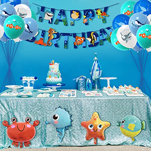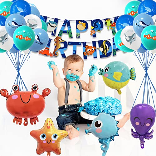 CIOUYAOS Kit decorazioni compleanno, blu palloncini tema mare 5pcs foil palloncini animali 1 Stendardo, addobbi per compleanno bambina Ragazzi (37pcs)