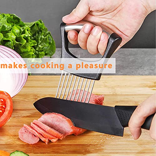 Qualità Premium: Forchetta per affettare la cipolla è realizzata con lame affilate in acciaio inossidabile alimentare di alta qualità e manici in plastica, resistenti e durevoli, non facili da deformare e possono essere a diretto contatto con il cibo.