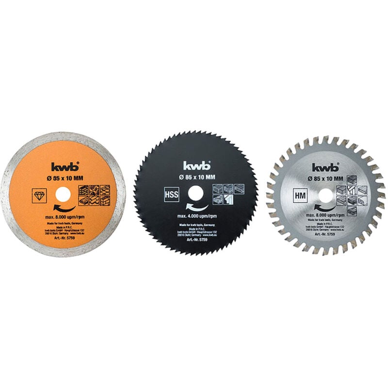 Set lame per mini sega circolare set 5 pezzi Contenuto: 1) una lama HSS da 85 x 10 mm, velocita' massima di 4000 giri/min., per la lavorazione del legno, 2) una lama per sega HM con dimensioni 85 x 10 mm, velocita' di 8000 giri/min., per lavorare con plastica e legno, 3) una lama per sega diamantata con dimensioni 85 x 10 mm, velocita' di 8000 giri/min., per lavorazione di pietra e piastrelle da 5 mm, 4) chiave esagonale, 5) rondella. set 5 pezzi Categoria dell'articolo: Utensili a mano ed articoli tecnici - Lame per seghetto
