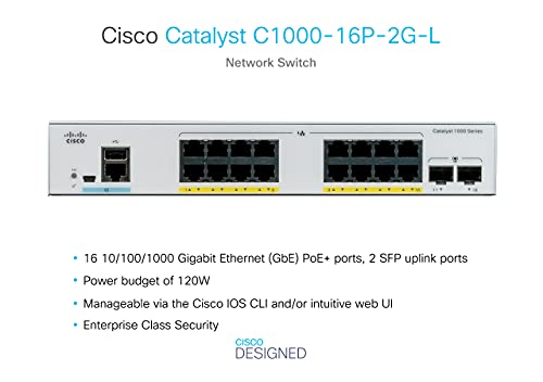 Cisco Catalyst 1000-16P-2G-L Switch di rete a 16 porte PoE+ Gigabit Ethernet, budget PoE 120 W, 2 porte uplink SFP da 1G, garanzia limitata a vita con formula avanzata (C1000-16P-2G-L), grigio