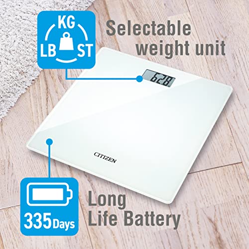 【Sensori di misurazione del peso preciso】Le pesapersone digitali Citizen sono dotate di sensori di misurazione del peso ad alta precisione che forniscono risultati esatti con una precisione di 0,1 kg. Come entità del gruppo Citizen, rimaniamo fedeli alla natura della nostra azienda fornendo una tecnologia di precisione compatta e collaudata.