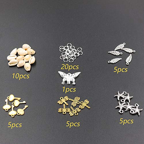 ️12 conchiglie, 5 stelle marine, 5 ciondoli a chiave, 5 ciondoli a foglia, 5 ciondoli a cuore, 20 anelli aperti di salto, 2 rotoli di corda elastica trasparente.