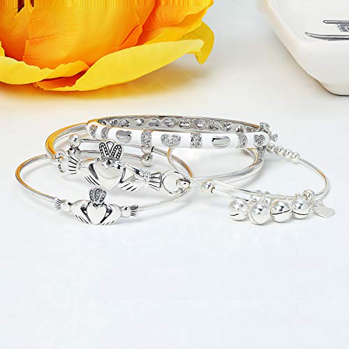 PREZZO CELTICO - Festeggia il suo orgoglio celtico con un braccialetto regolabile radiante. Questo bracciale da donna in argento .925 dal design elegante è evidenziato da un Claddagh, cuori, motivo a mano e corona al centro, con una brillante finitura lucida ad alta lucidatura.