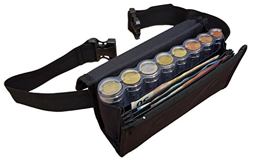 1- Marsupio Portafogli 6 tasche con Distributore Portamonete 8 tagli trasparente e graduato, realizzato in Tela di Poliestere con chiusura magnetica e accuratamente pensato per consentirvi di maneggiare i vostri contanti riducendo i tempi di cambio fino a 5 volte rispetto ad un comune portafogli