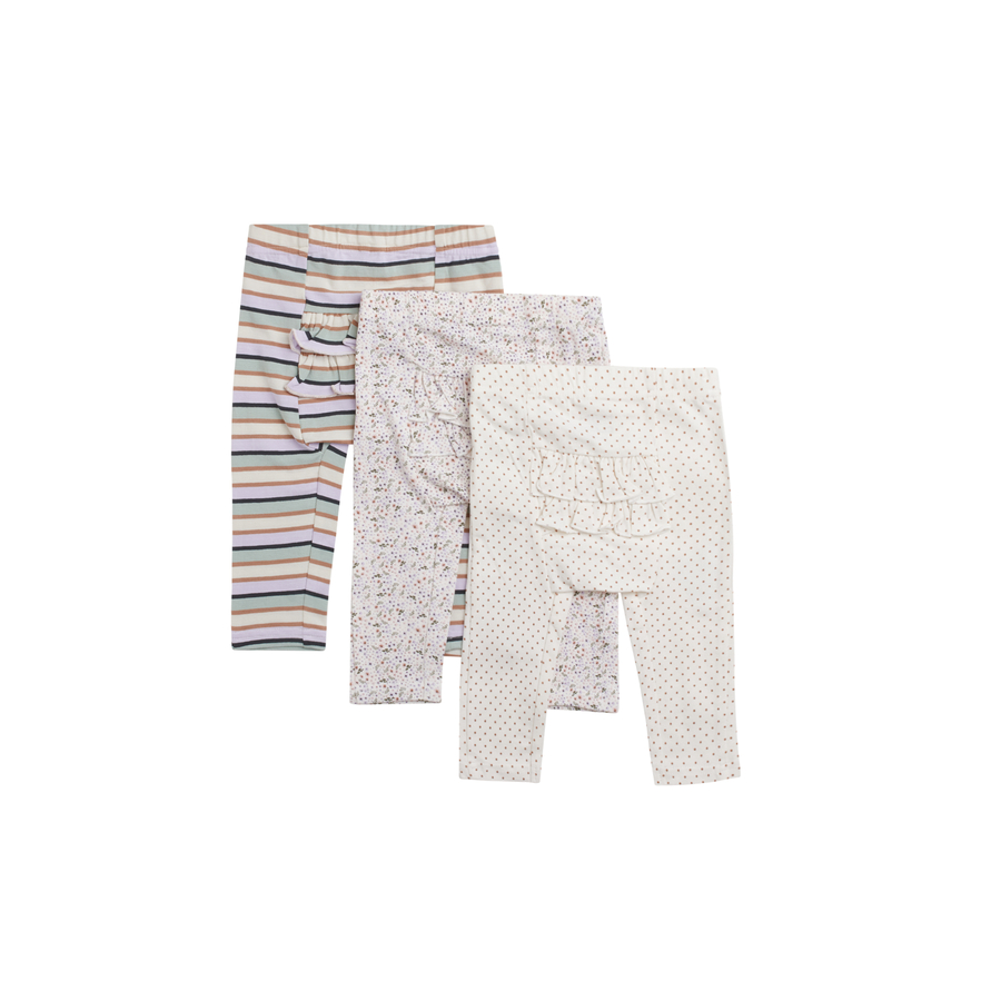 Dettagli del prodotto: Leggings a 3 pezzi Vita elastica Balze 1x a righe 1x fiori allover stampati 1x punteggiato Colore: White sand Materiale e cura: Materiale: 95% cotone, 5% elastan Lavabile fino a 30 °C Non immergere Si modella quando è bagnato Non asciugare alla luce diretta del sole