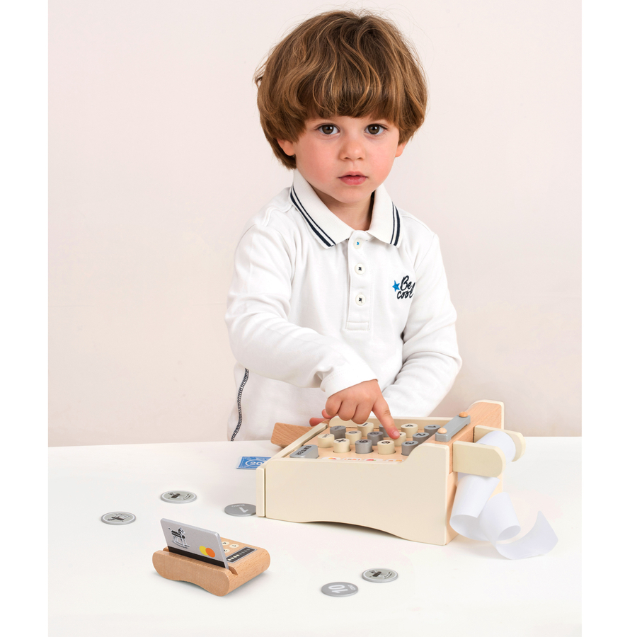 Dettagli del prodotto: Cha-ching! I più piccoli ameranno imparare le prime abilità matematiche e di ragionamento Giocare con questo registratore di cassa è un ottimo modo per i bambini di sviluppare le abilità sociali e linguistiche. Ispira anche il gioco immaginativo e permette di sviluppare le capacità di narrazione. Questo registratore di cassa è dotato di un cassetto estraibile, uno scanner, un lettore di carte, un rotolo di contanti e 30 monete giocattolo, 8 monete di legno e una carta di credito di legno. Dimensioni e peso: Dimensioni assemblate (lunghezza x larghezza x altezza): 21 x 12 x 17,5 cm Peso: 1 kg Materiale e cura: Materiale: Legno Incluso nella fornitura: 1 x New Class ic Toys Cassetta per contanti, crema
