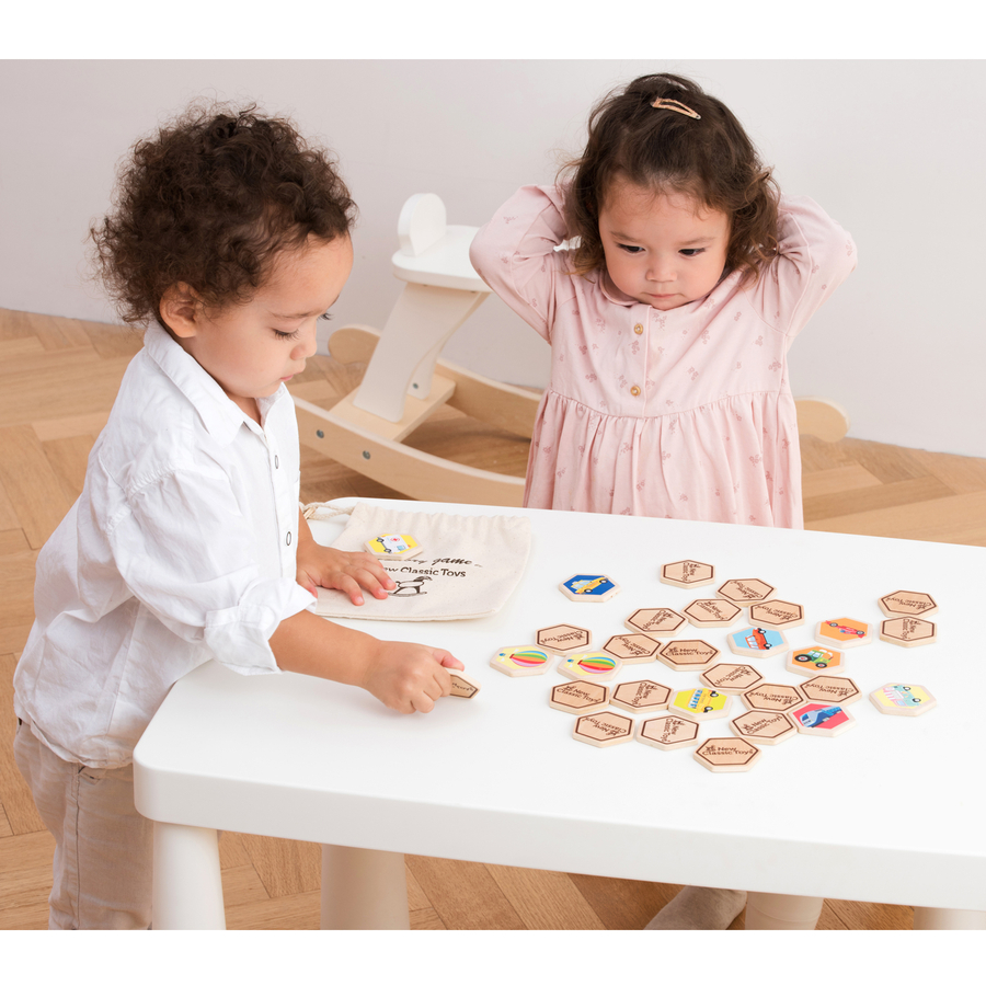 Dettagli del prodotto: Questo gioco è un'ottima attività per sviluppare la motricità fine, la capacità di risolvere i problemi e l'allenamento della memoria. Incoraggia il gioco sociale mentre i piccoli sviluppano le capacità di riconoscimento e di linguaggio Vince chi ha il maggior numero di tessere (coppie) alla fine della partita. In questo gioco classico, ci sono 16 coppie (32 pezzi) di tessere di legno con veicoli da combinare e collezionare. Viene fornito con un sacchetto di cotone per una facile conservazione Dimensioni e peso: Dimensioni della confezione (lunghezza x larghezza x altezza): 24 x 21 x 3,5 cm Peso: 0,4 kg Materiale e cura: Materiale: legno