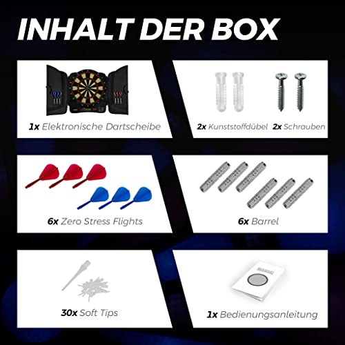Il bersaglio elettronico KOTO viene fornito con due set di freccette con punta morbida (6 pezzi). Le freccette KOTO con punta morbida sono costituite da punte morbide, canne, aste e alette. Oltre a questi due set completi di freccette con punta morbida, riceverai anche 24 punte extra morbide.