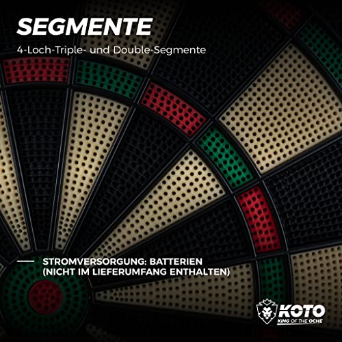 Il bersaglio elettronico classico KOTO Exact 590 può essere utilizzato da 8 giocatori diversi contemporaneamente. Possono giocare da soli contro il computer, uno contro l'altro, ma possono anche giocare a giochi diversi in squadre di due, tre o quattro giocatori.
