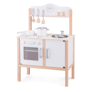 Una bella cucina bianca per bambini di New Classic Toys con tutti gli accessori necessari. Una padella con coperchio, una pentola, tre cucchiai da cucina, una saliera e una pepiera. Questa cucina è dotata di due piastre di cottura, manopole, un armadio, un forno con porta trasparente, un rubinetto e un lavello in metallo estraibile. Questa cucina in legno di New Classic Toys fa parte della linea di prodotti Bon Appetit. Tagliare, cuocere e a tavola! Le pentole, le padelle, i taglierini e gli utensili da cucina sono un must assoluto per i piccoli chef. Dettagli del prodotto: Dimensioni (lunghezza x larghezza x altezza): 60 x 30 x 78 cm Accessori inclusi Materiale: legno Età: a partire da 3 anni Attenzione Non adatto a bambini di età inferiore ai tre anni. Contiene piccole parti che possono essere ingerite. Rischio di soffocamento!