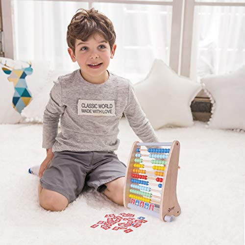 Pallottoliere in legno con 6 diversi colori. I bambini possono apprendere abilità diverse a seconda della fascia di età. Possono ruotare le perline, identifi care i colori. In età prescolare possono imparare la matematica usando anche le carte. Da 3 anni.
