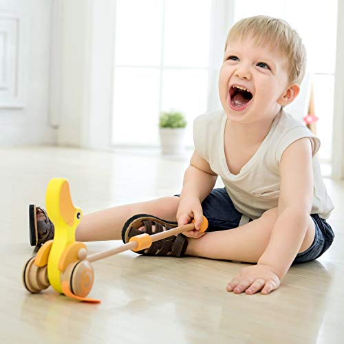 Adatta per invogliare il bambino a camminare, la simpatica papera gialla in legno si spinge facilmente grazie al pratico manico in legno ad altezza bambino piccolo