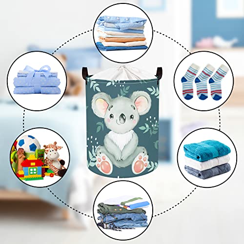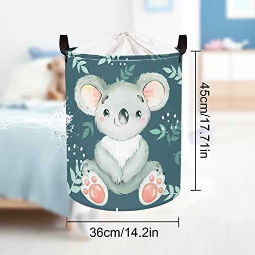 Ceste per la Biancheria Animali per Bambini - Un simpatico koala cartone animato seduto, due piccoli koala abbracciati, circondati da foglie e impronte verdi sparse, giocosi e adorabili, pieni di vaghezza e divertimento per bambini