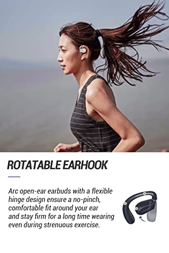 Design dell'orecchio aperto: gli auricolari ARC Open Ear si adattano avvitando sull'orecchio in modo sicuro, senza nulla nel condotto uditivo. Rimangono all'esterno dell'orecchio per ridurre la perdita dell'udito e non lasciano batteri nel condotto uditivo. Le cuffie leggere da 14,5 g con gancio per le orecchie rotante offrono un'esperienza di utilizzo senza pressione, senza pizzicare e confortevole.