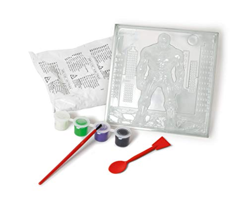 Il bambino potrà divertirsi a colare il gesso nello stampino e realizzare un modello del personaggio di Hulk da colorare con le tempere fluorescenti che brillano al buio.