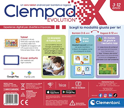Clementoni- Clempad Evolution-Tablet Bambini 3-12 Anni Educativo (Versione in Italiano) -8" IPS HD Screen, Memoria 16 GB, RAM 2G, Android 11, Multicolore, 16755