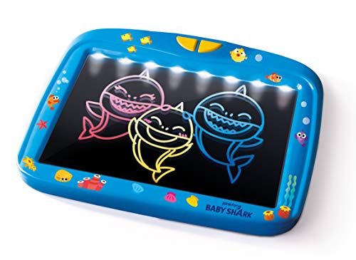 La lavagna effetti magici è un originale piano trasparente con luci LED rgb e pennarelli fluorescenti per divertirsi a disegnare scatenando la creatività in compagnia dei personaggi di baby shark