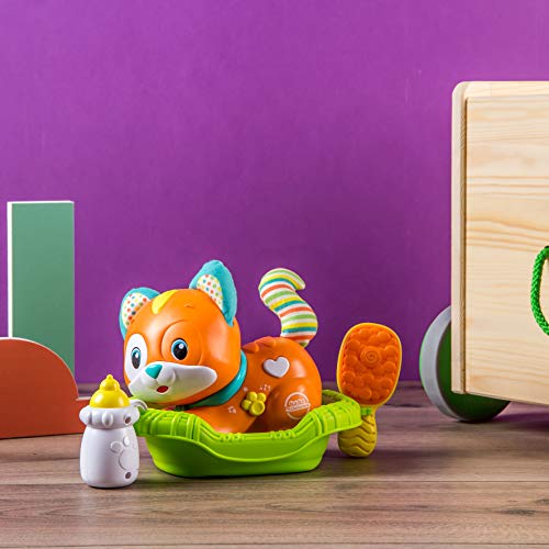 Il gattino si muove correndo avanti e indietro, mentre stimola il piccolo a seguirlo e giocare con lui