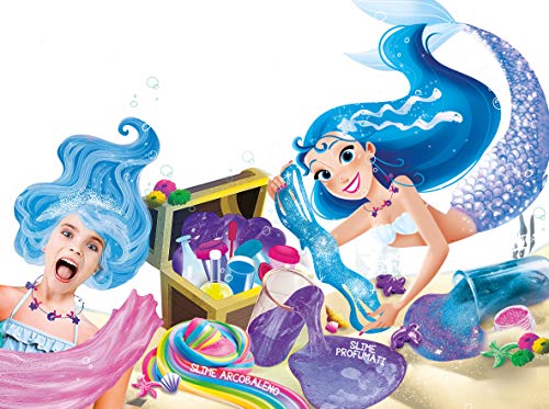 CONTENUTO DEL GIOCO: Il manuale illustrato come un libro coinvolge il bambino nel racconto grazie al personaggio della sirena che lo guiderà nella realizzazione dei diversi esperimenti di scienza passo dopo passo' Contiene tutto l'occorrente per realizzare gli slime, paillette e glitter per renderli scintillanti e colorati, aromi per profumarli e ciondoli marini per creare la collana della sirena Azzurra