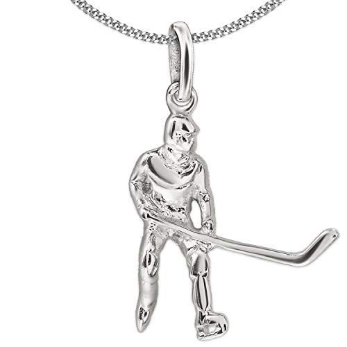 Clever Schmuck Set di ciondoli in argento con giocatore di hockey su ghiaccio, 17 x 19 mm, in 3D e lucido, con catena da 45 cm, in argento Sterling 925, con custodia blu