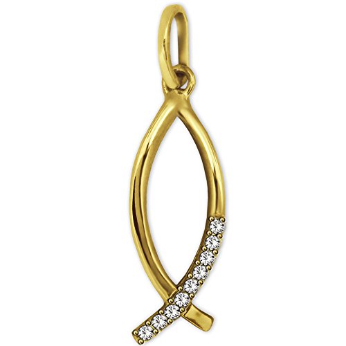 Clever Schmuck Ciondolo da donna con simbolo di Gesù a forma di pesce, 18 mm, con molti zirconi lucidi, oro 333, 8 carati
