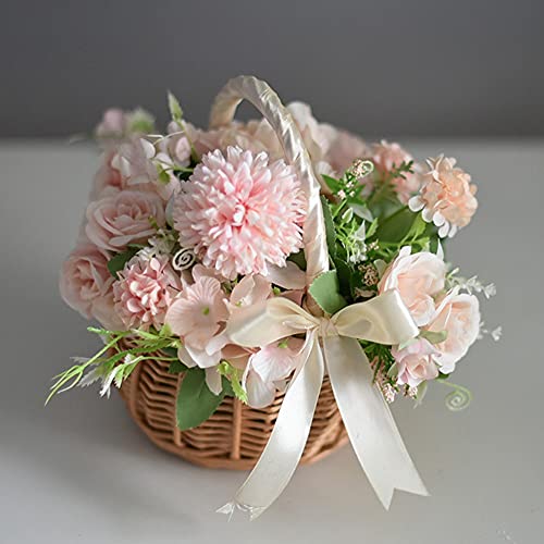 Cliettilw Cesto di fiori intrecciati in vimini, con manico e nastro, decorazione per la casa del giardino (S)