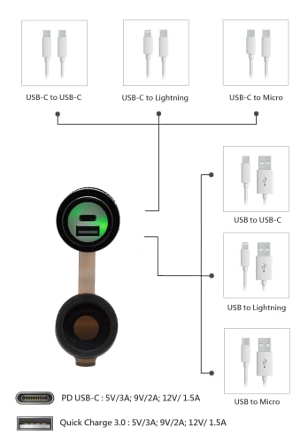 Doppie porte USB potenti e intelligenti Sia la porta USB-C PD da 18 W che la porta USB-A Quick Charge 3.0 da 18 W consentono agli utenti di caricare contemporaneamente più dispositivi in tempo record, con una potenza massima totale di 6A/36W (ingresso: 12-24V), senza sovraccaricare e rallentare. Perfetto per dispositivi Android e iOS!