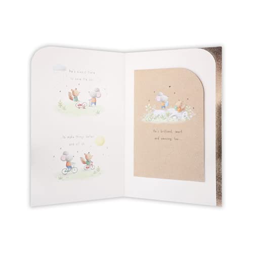 All'interno del messaggio recita: He's always there to save the day... ... to make things better and all ok (insert 1) He's brilliant, smart and amazing, too... (insert 2) ...I'm proud to have a Dad like you! (inserire 3) Festa del papà felice con un sacco di amore