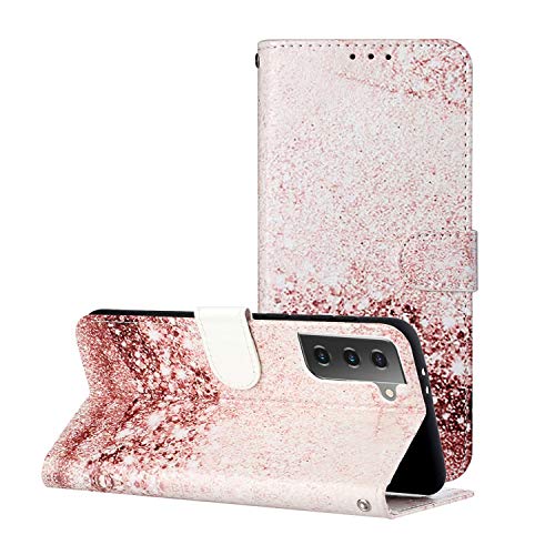 CLM-Tech Cover Compatibile con Samsung Galaxy S21, Sintetica Pelle Custodia, Portafoglio con Funzione Supporto e Slots, Glitter Oro Rosa