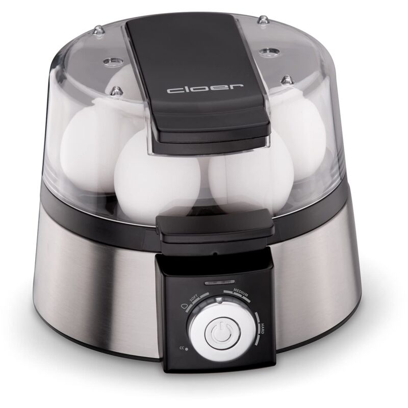 Cuociuova elettronico 6070 - Per fino a 7 uova. - Manopola per regolare il grado di durezza: Soft, Medium, Hard - Funzione di cottura avanzata: cuoce diversi livelli di cottura in un solo processo di cottura, morbido, medio e duro - Pulsante start/stop. - Contenitore di cottura in acciaio inox. - Portauovo rimovibile. - Misurino con beccuccio - Messaggio acustico finito - Coperchio con funzione di servizio. Inclusi 3 vaschette per uova - Avvolgicavo. - Cassa in acciaio inox con elementi in plastica nera. - L = 18 cm x P = 21 cm x H = 15 cm. - 1, 1 kg, 220 240 Volt, 364 - 435 Watt.