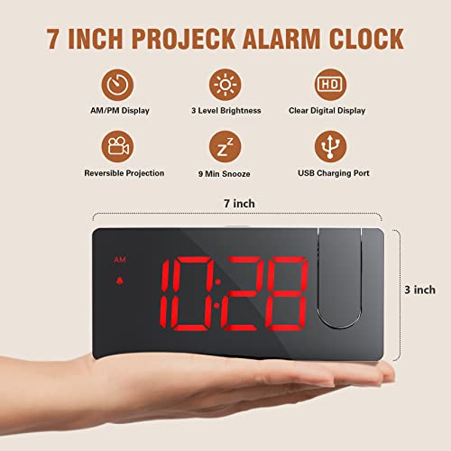Cloksnooz Sveglia a proiezione, orologio digitale rosso da 7 pollici, sveglia con schermo a LED curvo per camera da letto, con caricatore USB, posticipo, 12/24 ore, 4 livelli senza luminosità (Rosso)