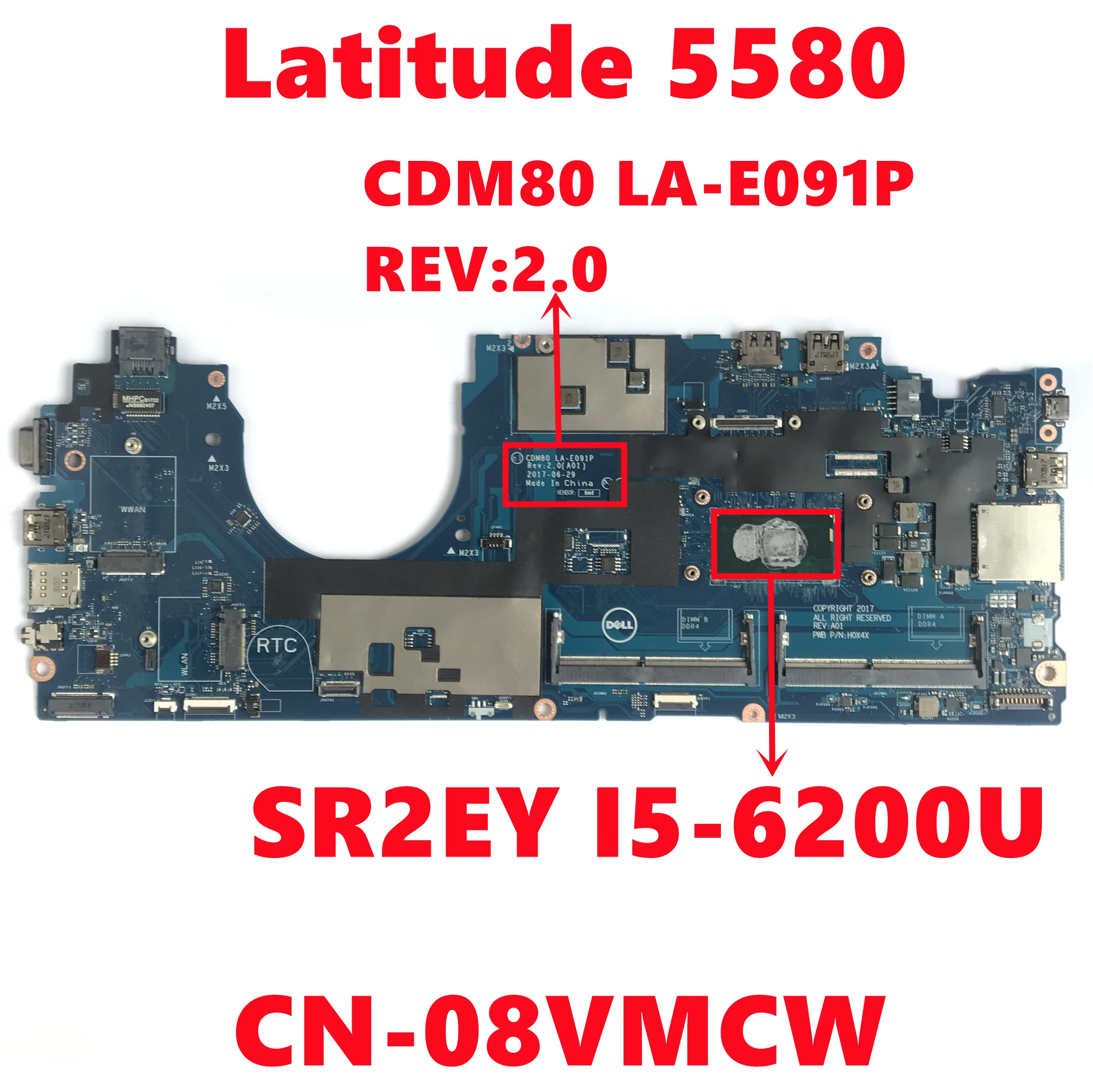 CN-08VMCW 08VMCW 8VMCW For Dell Latitude 5580 Laptop Motherboard CDM80 LA-E091P REV:2.0 With I5-6200U CPU 100% Fully Tested work
