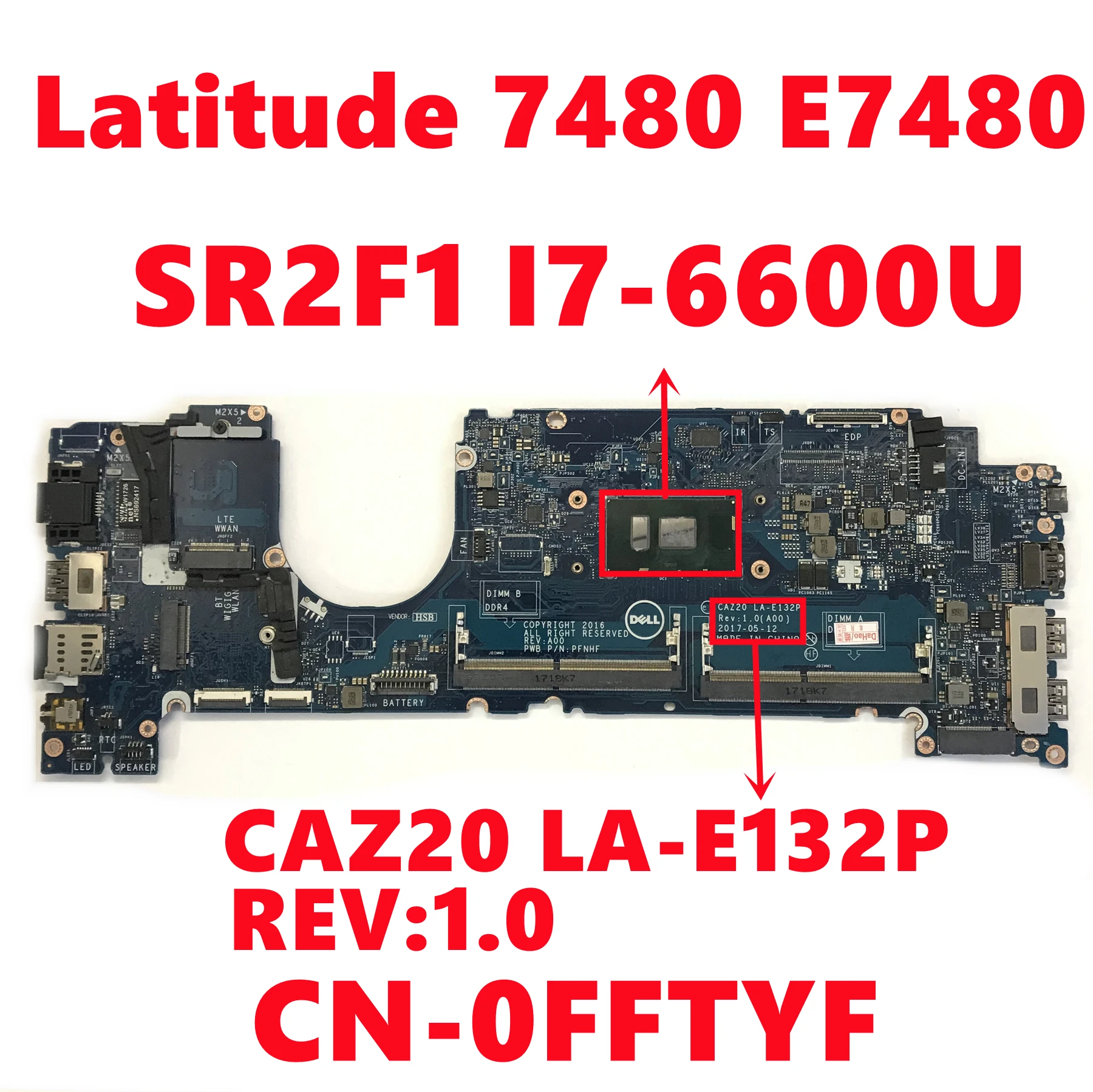 CN-0FFTYF 0FFTYF FFTYF For Dell Latitude 7480 E7480 Laptop Motherboard CAZ20 LA-E132P REV:1.0 W/ SR2F1 I7-6600U Fully Tested OK