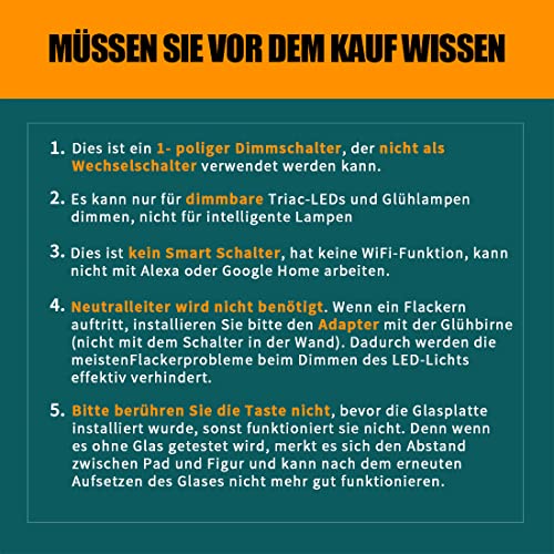 Lampadine compatibili: interruttore dimmer a 2 vie a 1 polo. Non c'è bisogno di conduttori neutri. Supporta massimo 300 W. LED dimmerabile o massimo Lampadina a incandescenza da 700 W, AC 110-240 V. L'adattatore a LED nei prodotti previene efficacemente il 99% del problema dello sfarfallio quando la luce è dimmerabile.