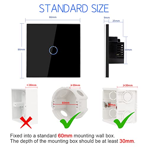 Touch Control: 40 ms. L'indicatore LED indica lo stato di accensione/spegnimento. Basso consumo energetico e lunga durata. Utilizza una lastra da parete in vetro temperato impermeabile da 4 mm che è più sicura di un bottone a pressione e impedisce scosse elettriche, anche se toccata da mani bagnate.