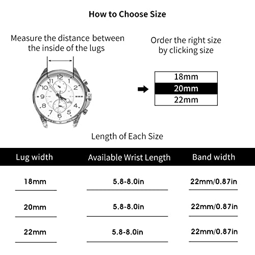 Dimensioni del cinturino dell'orologio: si prega di misurare attentamente la larghezza dell'ansa prima dell'acquisto. Il nostro cinturino ha tre opzioni di larghezza dell'ansa di 18 mm, 20 mm e 22 mm.