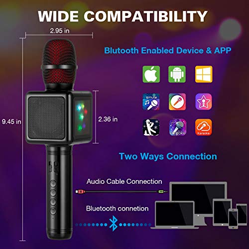 【Alta Compatibilità & Facile da Usare】Supporta tutti i tipi di software di karaoke/ app su smartphone, computers, iPad, e MID. Facile da collegare a lettori audio via Bluetooth o con il cavo audio(3.5mm AUX). Godetevi il vostro canto con questo portatile microfono wireless in qualsiasi momento.