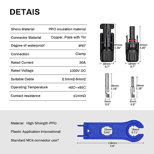 【Compatibile con diametro (2.5m㎡ - 6m㎡)】I connettori solari maschio/femmina sono compatibili con diversi diametri di cavi, compresi 2.5m㎡ a 6m㎡ (14AWG-10AWG), che possono bloccare saldamente il cavo e avere un ottimo effetto di tenuta.