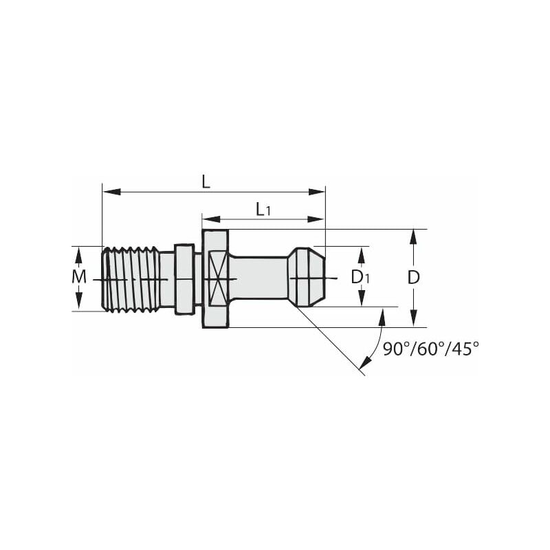 Questo codolo di serraggio permette di trascinare il portautensili dal dispositivo di presa del mandrino per fissarlo saldamente nel mandrino stesso. Disponibile in diverse esecuzioni, costituisce un importante elemento di congiunzione tra macchina e utensile. I codoli di serraggio presentano requisiti molto elevati in termini di precisione, resistenza e affidabilità. Uso: Per mandrini con attacco JIS B 6339 (MAS-BT) / ISO 7388-2. Nota: A tenuta stagna − con o-ring. La rispettiva chiave di serraggio con le relative aperture è disponibile nell'eShop. Durante il montaggio di AB, assicurarsi che la coppia di serraggio sia corretta. Dati tecnici Norma codoli di serraggio MAS 403 Caratteristica di foratura con foro Tipo di prodotto Codolo Filettatura M M24 Apertura, mm 30 ⌀ Testa D1, mm 23 Lunghezza complessiva L, mm 85 Coppia di serraggio massima, N·m 150 L1, mm 45 Adatti per coni 50 Giunto di ⌀ D, mm 38 Adatti per coni con codice a colori SK 50