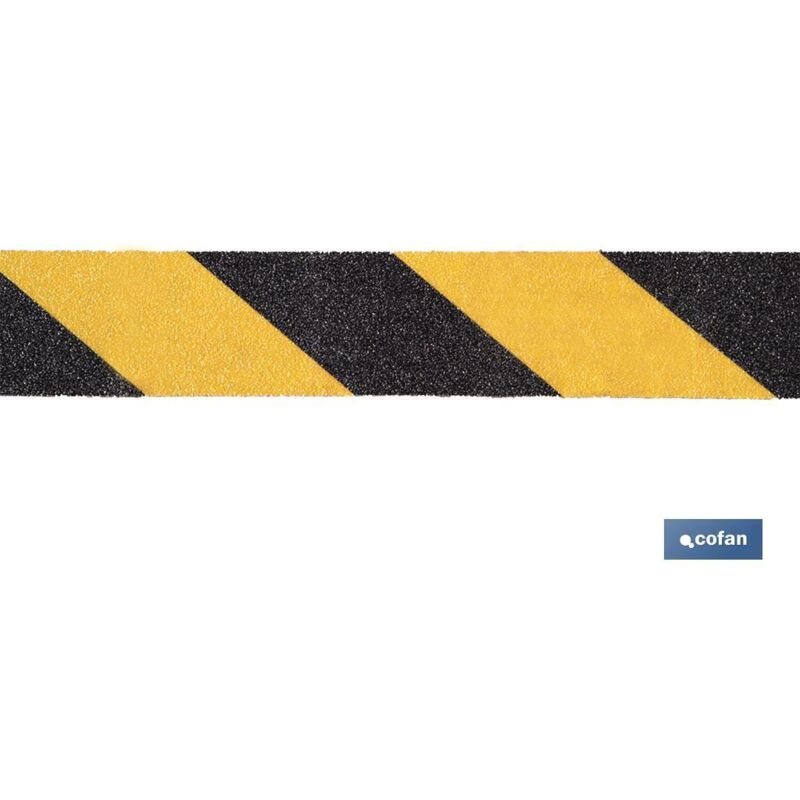 Nastro antiscivolo autoadesivo giallo e nero di 25 e 50 mm di larghezza e 18 metri di lunghezza.