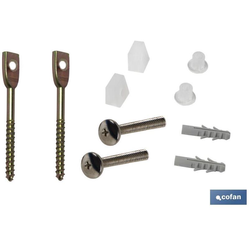 Set di viti per il fissaggio perfetto del wc, bidet o lavabo al pavimento. Questo set è composto da due viti M5 x 75, tasselli e tasselli per il fissaggio orizzontale. Supporto perfetto e durata garantita. Le viti sono in ferro bicromato. Caratte