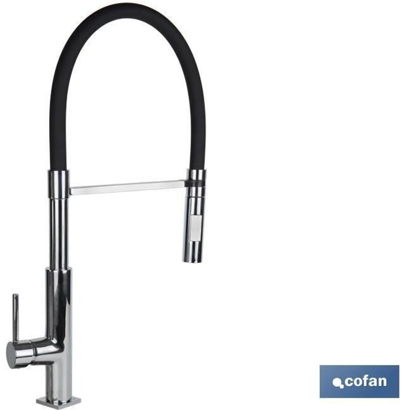 Rubinetto da cucina monocomando realizzato con tubo flessibile in silicone da 50,5 cm di colore nero. Il suo design prevede una bocca alta con due tipologie di getto: getto normale e getto doccia. Il tubo in silicone ha una funzione girevole a 360° che