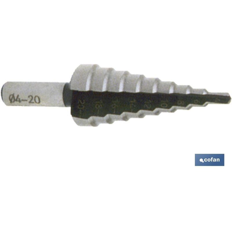 PUNTA A GRADINO SVASATORE HSS. Punta rettificata in acciaio rapido con due tagli sfalsati. Caratteristiche tecniche: Gamma punte: 50 - 60 Lunghezza [mm]: 97