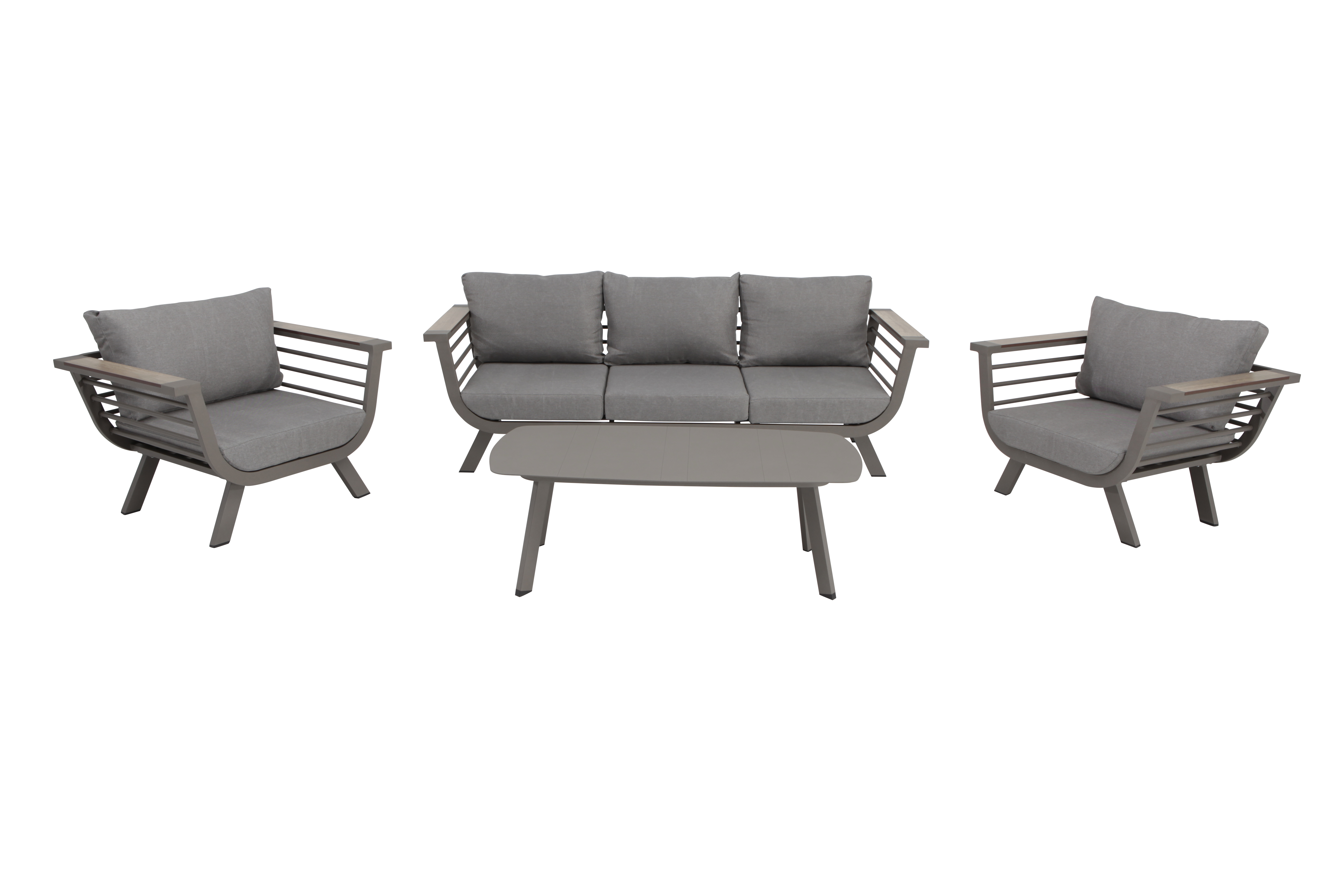 Coffee set con materiale principale alluminio e di colore Grigio. Ideale fino a 5 persone. La struttura in alluminio è garanzia di resistenza alla ruggine e agli agenti atmosferici.. I rivestimenti del cuscino sono sfoderabili per una facile pulizia