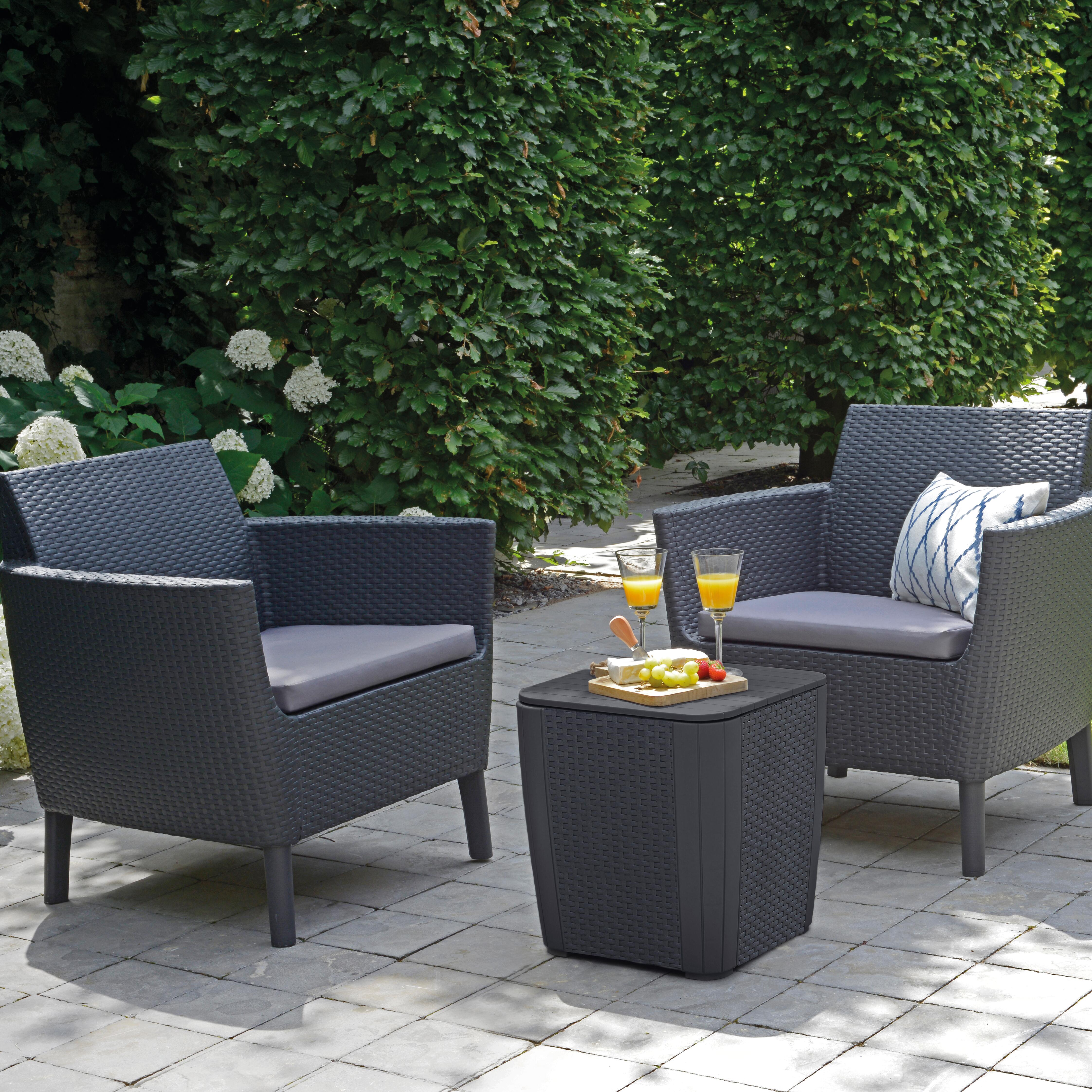 Set balcony da esterno - con 2 poltrone e 1 tavolo contenitore - cuscini inclusi, design moderno con finitura in trama simil rattan