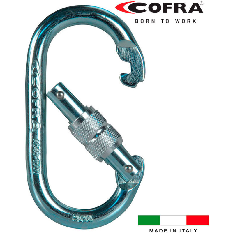 Moschettone a vite in discesa cofra. serratura in acciaio. connettore base con blocca filetto. norme: en 362:2004. apertura 16mm. blocco: anello filettato. acciaio zincato. resistenza minima: 23kn, peso: 160g