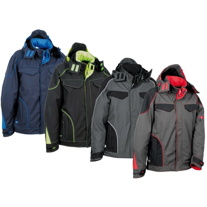GIACCA SOFTSHELL TECKA - tg.48 - navy/royal felpa dotata di 2 ampie tasche petto chiuse con velcro, 2 ampie tasche anteriori chiuse con zip, 1 tasca sulla manica sinistra chiusa con zip, cappuccio regolabile, staccabile e con inserti in gomma per una migliore visibilità, polsini regolabili con tirante in velcro, apertura centrale con zip YKK®, giacca SOFTSHELL con interno in tessuto pile, regolazione fondo tramite coulisse - tessuto softshell 100% poliestere, membrana COFRA-TEX, pile interno 100% poliestere - area d'uso: aeroporti, agricoltura, contro il vento, edilizia, industria, logistica - impermeabile, traspirabile, contro il vento - non rilevabile dai metal detector - 300 g/m²
