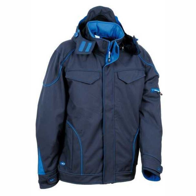GIACCA SOFTSHELL TECKA - tg.54 - navy/royal felpa dotata di 2 ampie tasche petto chiuse con velcro, 2 ampie tasche anteriori chiuse con zip, 1 tasca sulla manica sinistra chiusa con zip, cappuccio regolabile, staccabile e con inserti in gomma per una migliore visibilità, polsini regolabili con tirante in velcro, apertura centrale con zip YKK®, giacca SOFTSHELL con interno in tessuto pile, regolazione fondo tramite coulisse - tessuto softshell 100% poliestere, membrana COFRA-TEX, pile interno 100% poliestere - area d'uso: aeroporti, agricoltura, contro il vento, edilizia, industria, logistica - impermeabile, traspirabile, contro il vento - non rilevabile dai metal detector - 300 g/m²